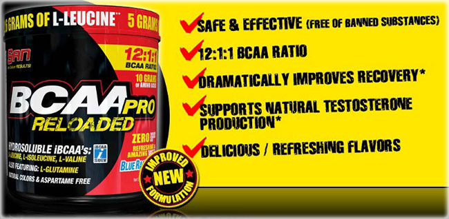 Questo nuovo integratore prodotto dall'azienda San Nutrition, Bcaa Pro Reload, è costituito da amminoacidi a catena ramificata con una particolare formulazione 12:1:1 con aggiunta di L-Glutamina purissima. Bcaa Pro Reload viene prodotto completamente privo di carboidrati ed svolge nuomerose azioni per il recupero muscolare.