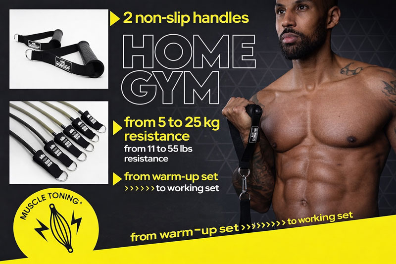 kit home gym compatto da 18 pezzi con resistenza progressiva fino a 25 kg, pensato per sportivi e persone attive che desiderano allenarsi in modo completo, pratico e versatile.